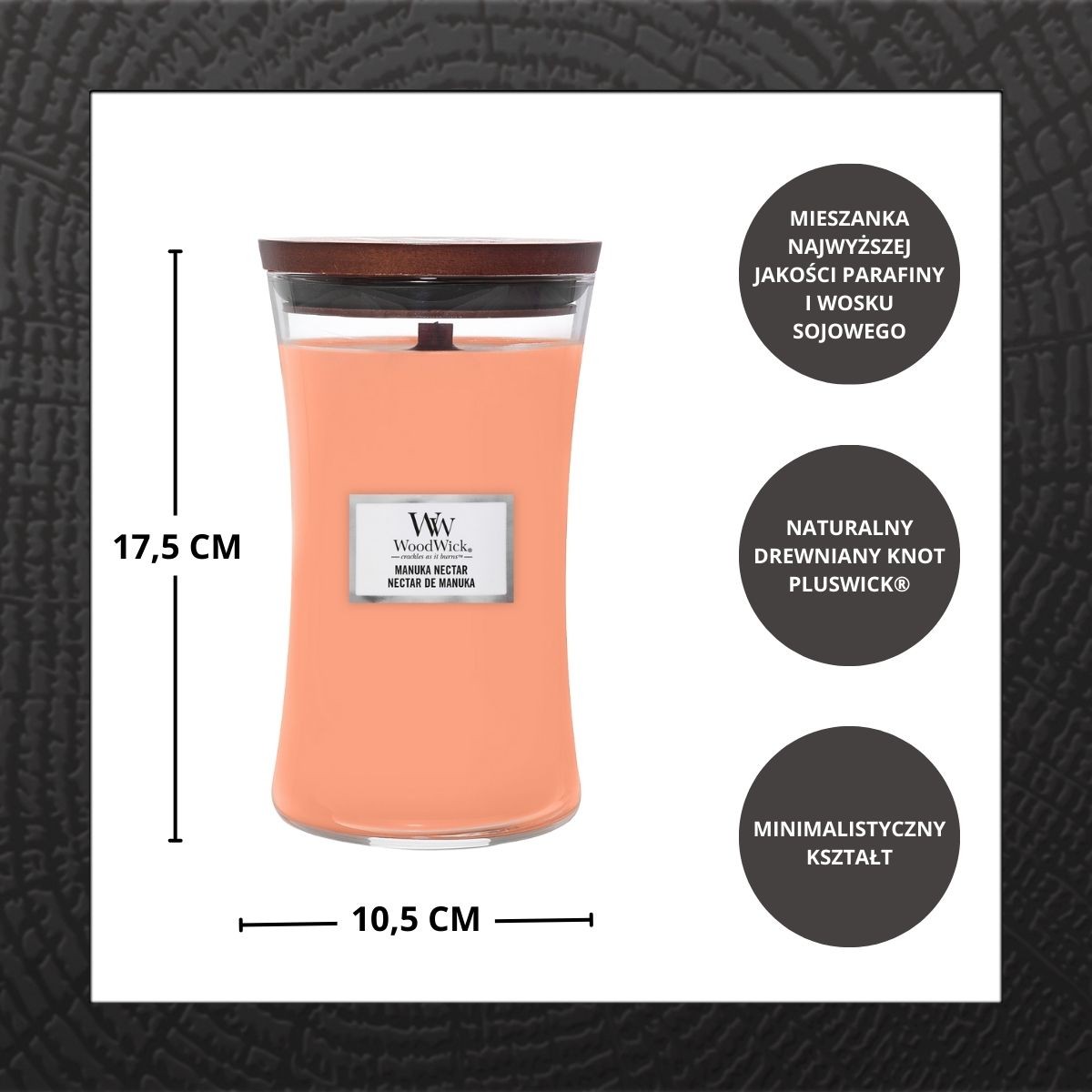 WoodWick MANUKA NECTAR to esencja wyrafinowanego relaksu, zamknięta w eleganckiej formie świecy zapachowej. Inspirowana rzadkim nektarem manuka, kompozycja zapachowa zachwyca szlachetną słodyczą miodu, subtelnie przełamaną aksamitnymi nutami kwiatowymi i delikatną świeżością.